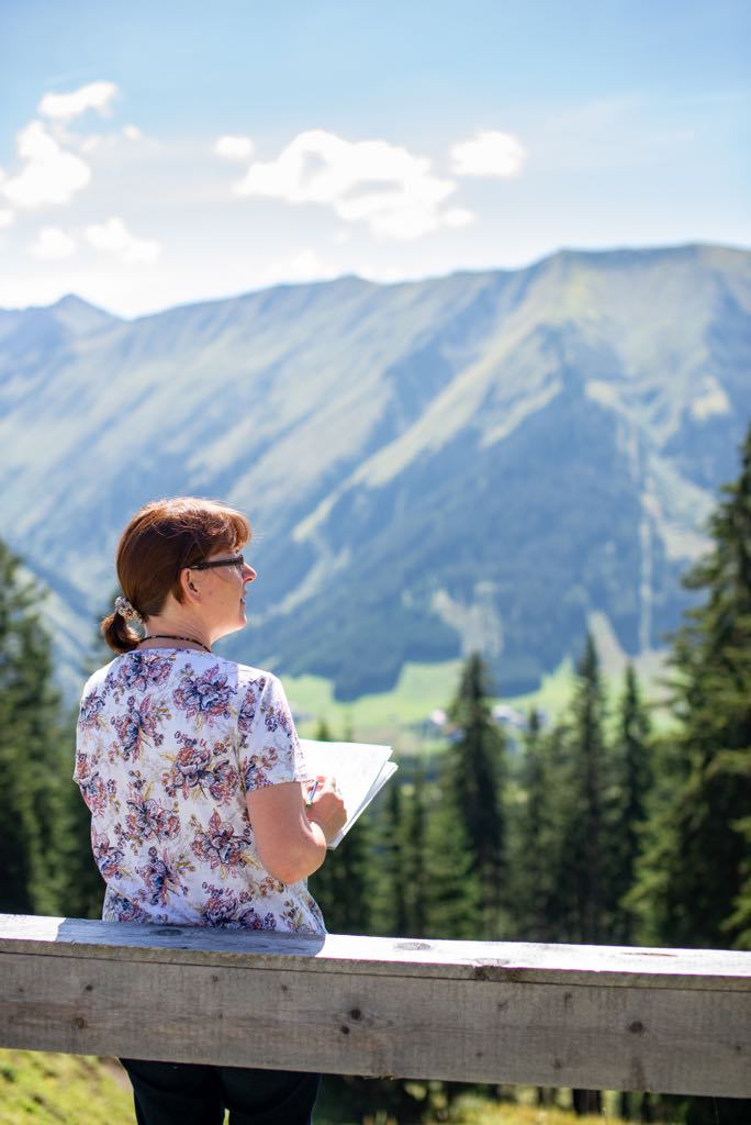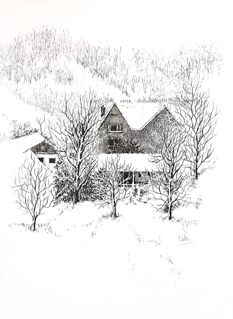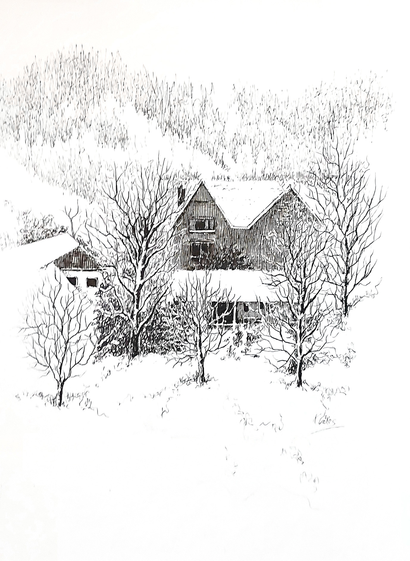 I have visited Austria in the winter many times and love to paint and draw its snowy landscape. For this painting I referred to several of my photos and videos from my visits and developed a composition based on elements that appealed to me. I thought soft rust brown trees would work well against the dark blue/ green of the fir trees and some bright sunshine behind the mountains would lift the whole piece. To harmonise the painting these colours appear in the foreground snow too. A snow hut and little twigs peeking out of the snow help to balance the composition and add interest.