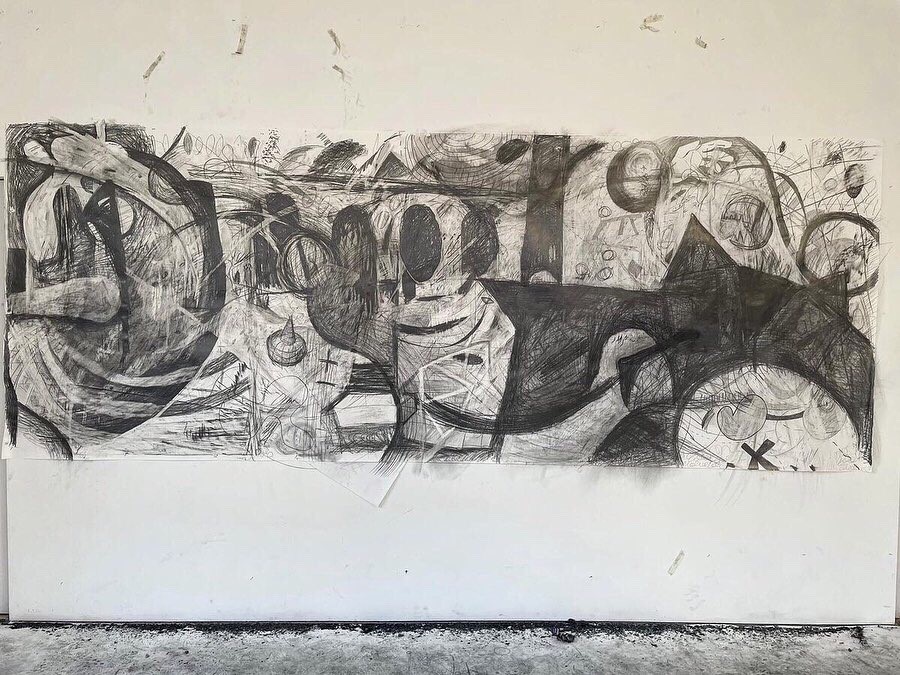 “Drawing is a big part of each of our artistic practices. We are using the opportunity and space to work collaboratively on making large scale drawings with a focus on mark making. Drawing is an accessible and dynamic art form because it doesn’t require vast amounts of space or resources. A drawing could be intuitively etched into the earth with a stick or it may require much intimate concentration in the studio.