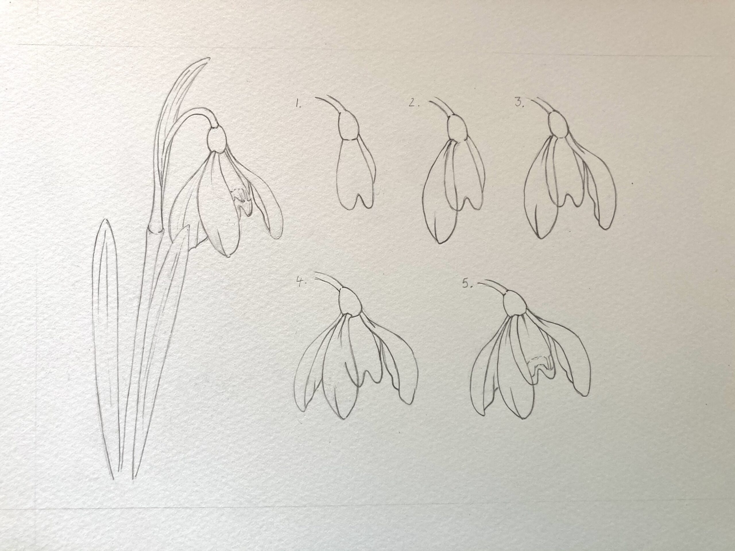Step by Step drawing of a snowdrop with Karen Green - botanical art tutor at Pegasus Art.