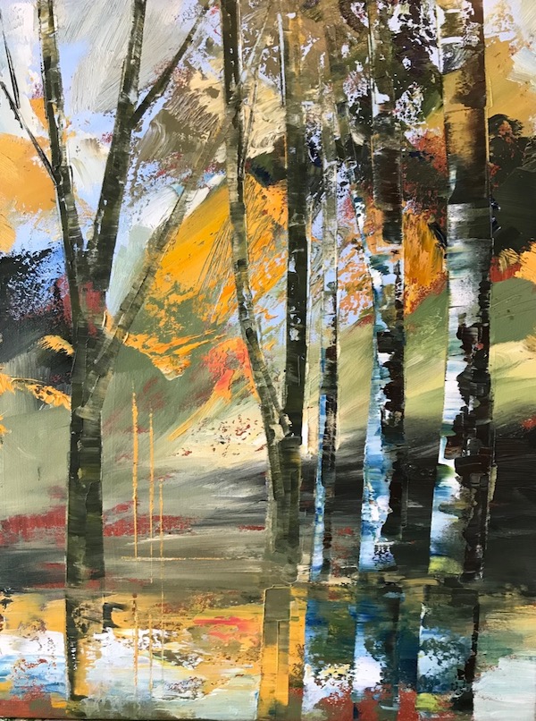 My beautiful surroundings particularly at Knightshayes National Trust inspired this piece, the stunning autumn colours turn woodlands into magical places. The materials I used are oils on canvas and the tools palette knives and scrapers.